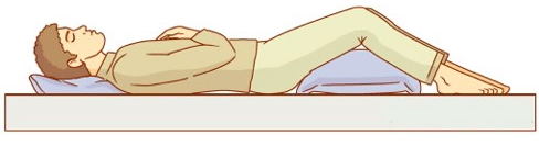 Las piernas deben estar ligeramente flexionadas. Aunque aquí diferenciamos entre pierna superior e inferior. La pierna que está en contacto con el colchón casi no se flexiona, mientras que la pierna que se apoya contra ésta está flexionada ligeramente. Con esto conseguimos que el psoas no traccione las vértebras y no aumente la curvatura lumbar.